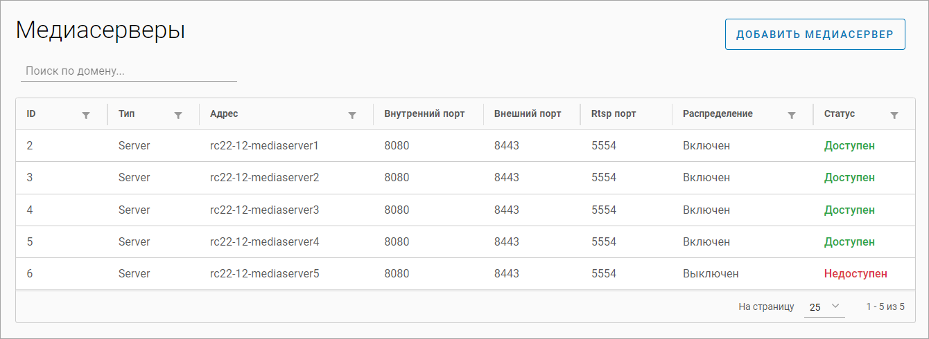 Для поиска введите хотя бы один символ в поле поиска. Поиск выполняется по полю «Адрес» медиасервера.