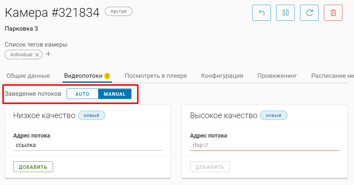 Если на вкладке «Видеопотоки» недоступна возможность добавить ссылки на видеопотоки и нет кнопки «Добавить», переключите тип заведения потоков с «Auto» на «Manual».