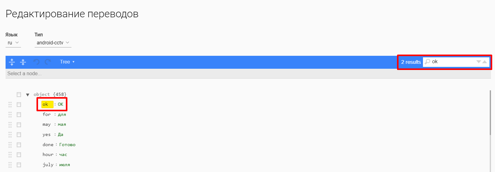 Результаты поиска выделяются желтым цветом. Слева от поле поиска отображается количество результатов поиска.