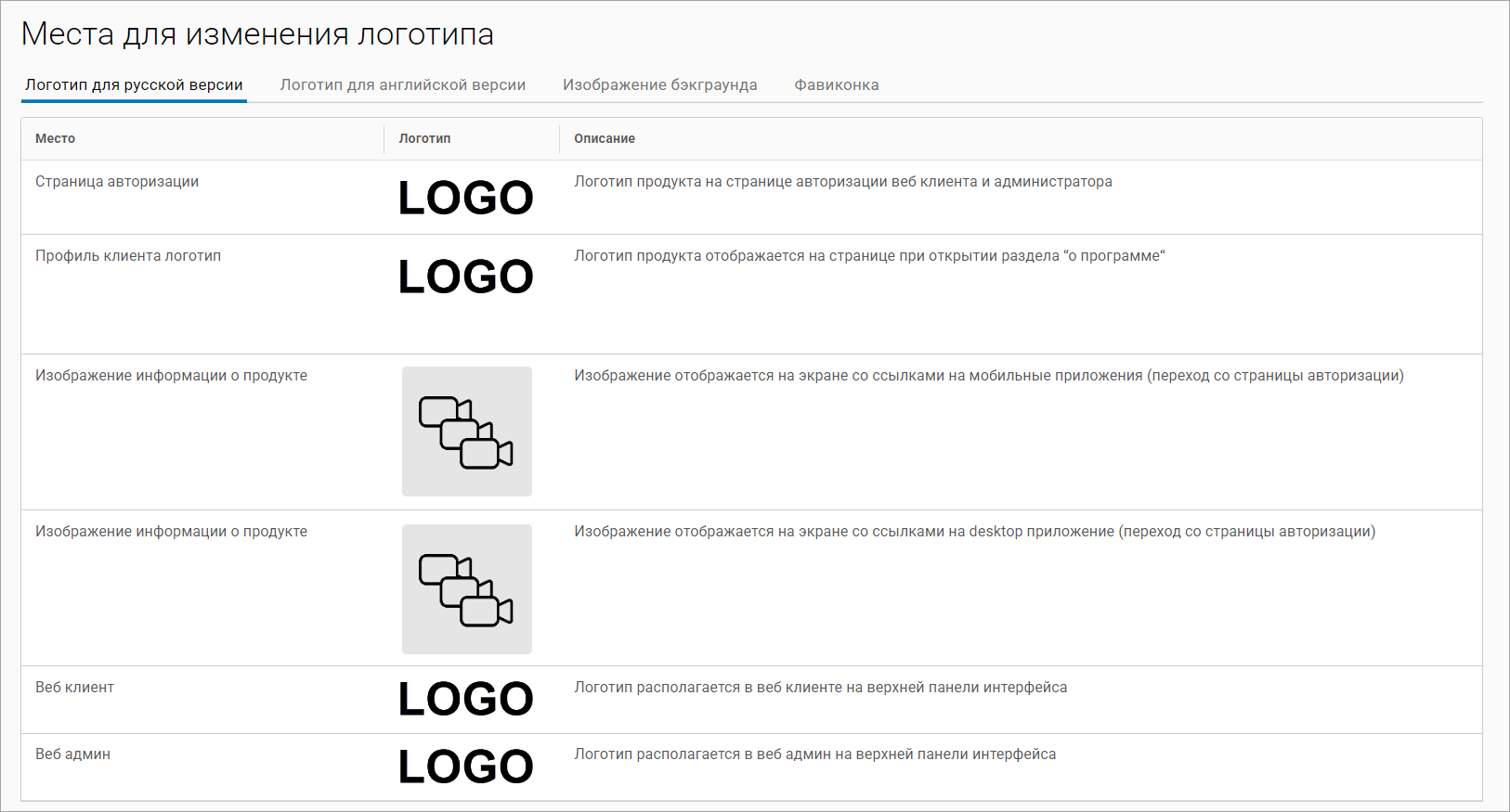 Вкладки «Логотип для русской версии» и «Логотип для английской версии» предназначены для загрузки изображений, которые отображаются в web-интерфейсах администратора и пользователя при выборе русского и английского языка соответственно.