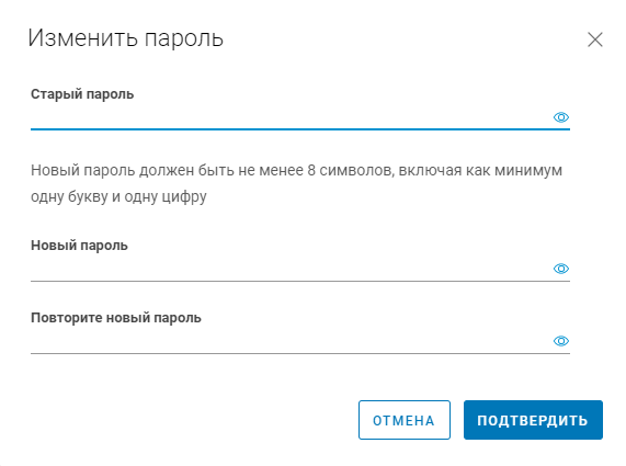 Укажите старый пароль. Введите и подтвердите новый пароль, соблюдая количество и наличие необходимых символов.