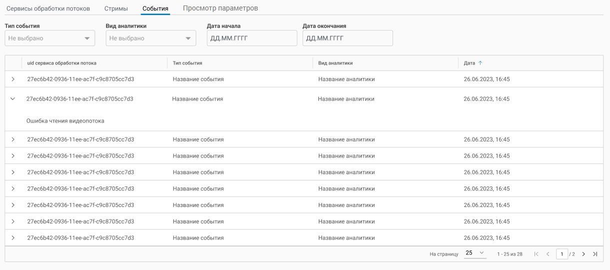 На вкладке отображается список событий о результатах работы сервиса обработки потоков.