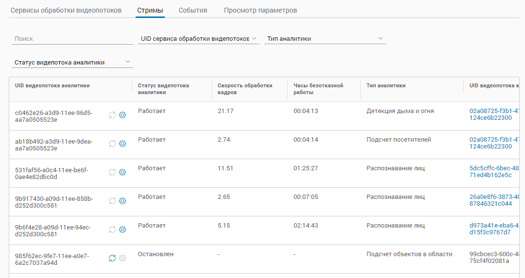 UID видеопотока аналитики – UID видеопотока аналитики. Для каждого видеопотока отображаются кнопки: