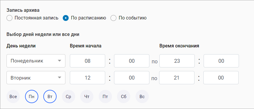 По событию – данный вариант доступен только при подключении сервиса «Детекция движения». При подключенном сервисе и выборе данного варианта запись начинается в случае, когда камера определит движение. Запись осуществляется в течение трех минут с момента определения события