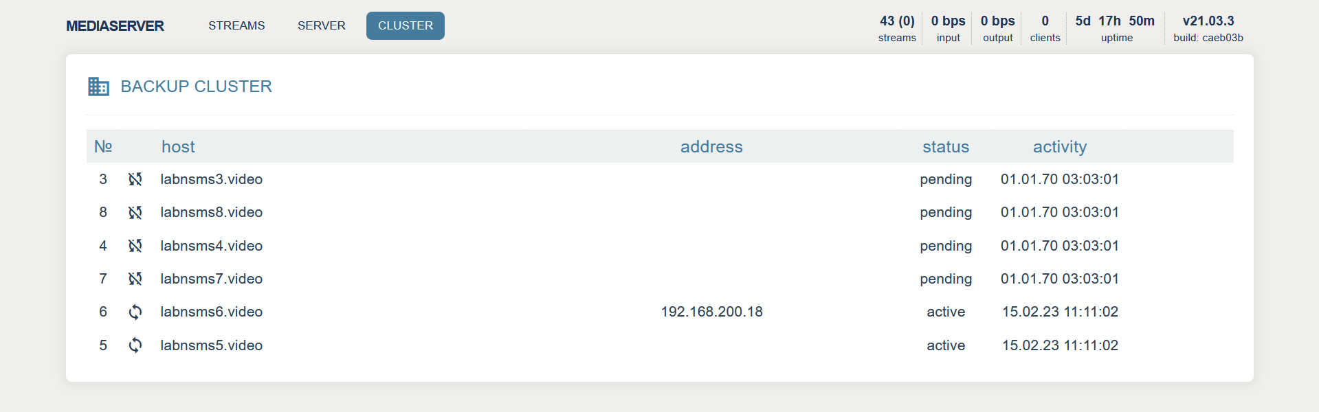 Вкладка «Cluster» является информационной, которая отображает состояние и активность кластеров.