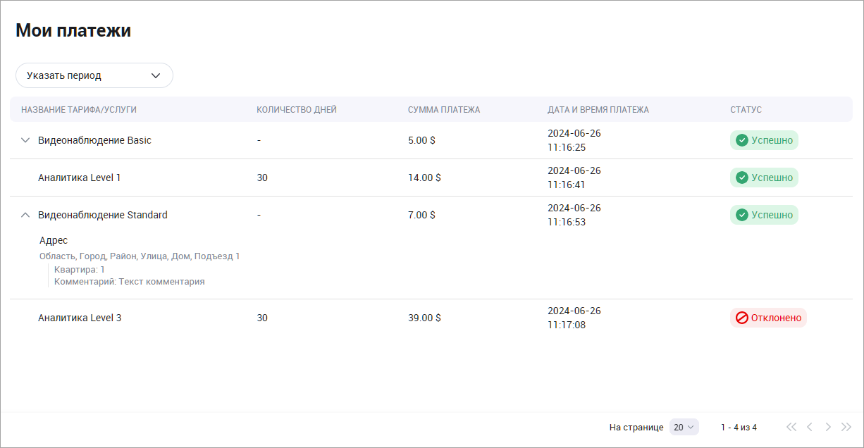 Предусмотрена фильтрация по периоду платежей. Доступные значения фильтра: 7 дней, 30 дней, 3 месяца и задаваемый период.