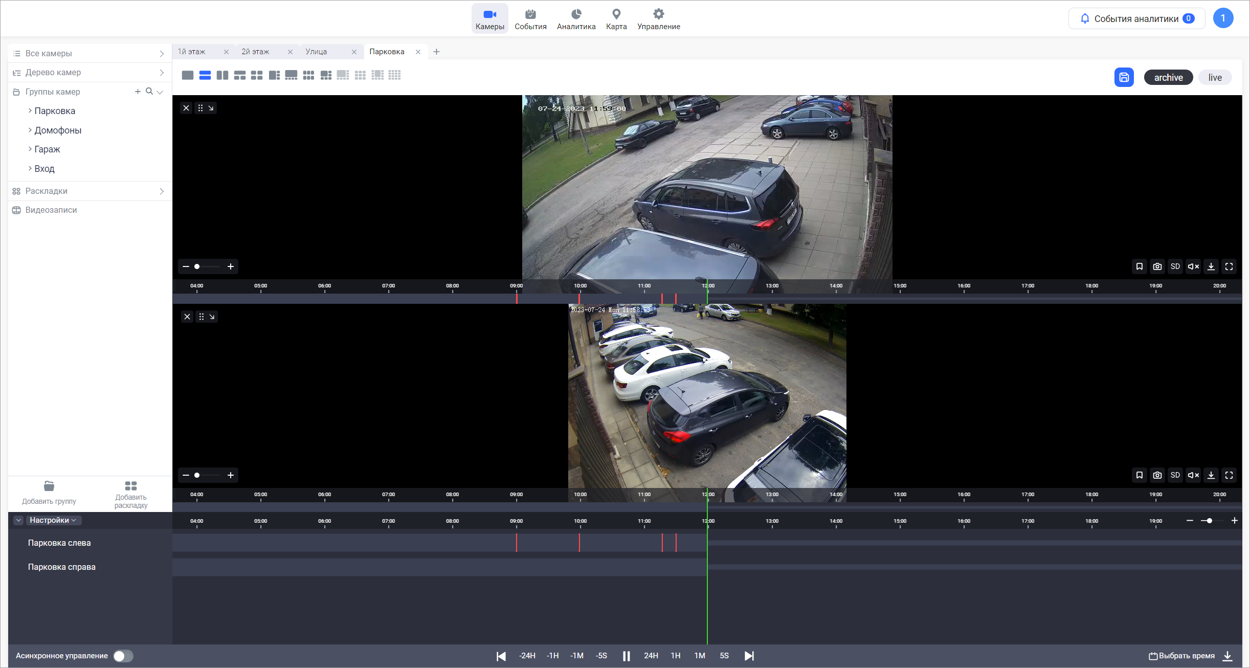 Функция позволяет открыть камеры группы в новой раскладке для одновременного просмотра трансляций с выбранных камер. Допускается выбор не более шести камер.