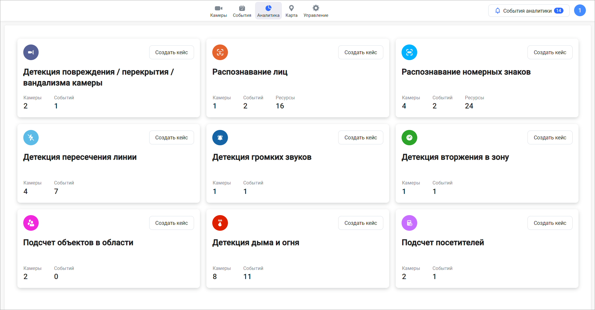 Общее количество камер, задействованных во всех кейсах с данным видом аналитики. При нажатии на число выполняется переход на вкладку «Камеры», где отображается список камер с фильтрацией камер по виду аналитики