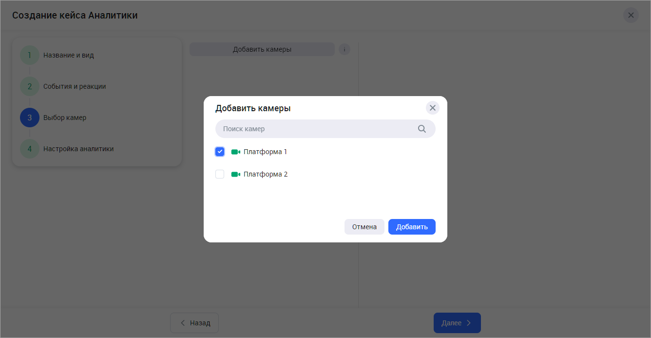 Нажмите «Добавить камеры». В результате отобразится форма выбора камер. При необходимости воспользуйтесь поиском камер по названию