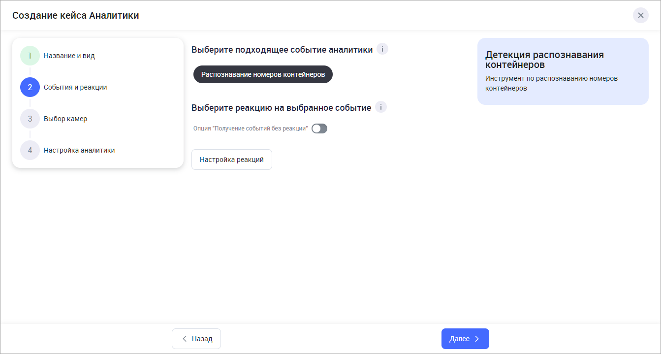 На данном шаге настраивается общий список событий и реакций на события. Далее на Шаге 4 при настройке аналитики вы сможете выбрать из этого списка события и реакции при настройке каждой камеры отдельно.