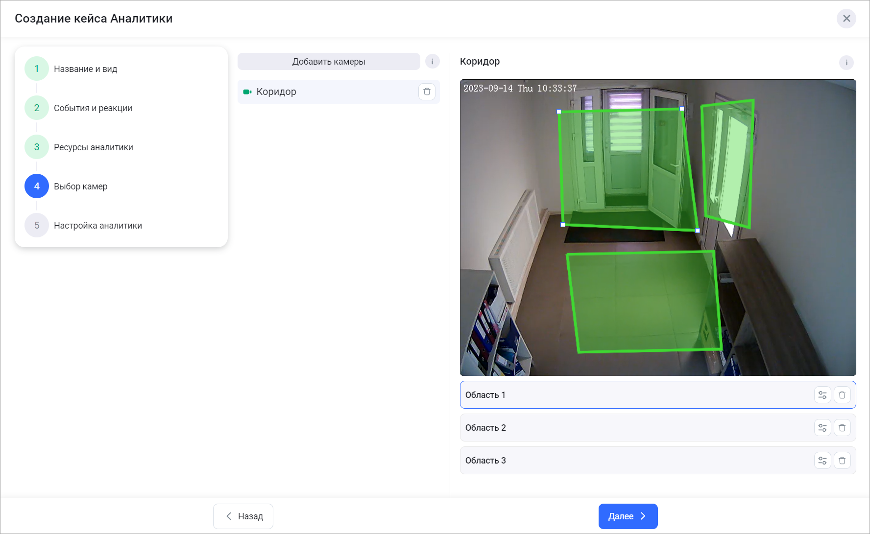 Шаг 4 «Выбор камер». Настройка областей