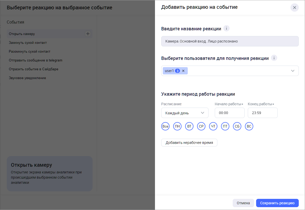 В результате созданная реакция отобразится в списке реакций выбранного типа. Для того, чтобы далее использовать созданную реакцию при настройке камер, нажмите «Добавить реакции».