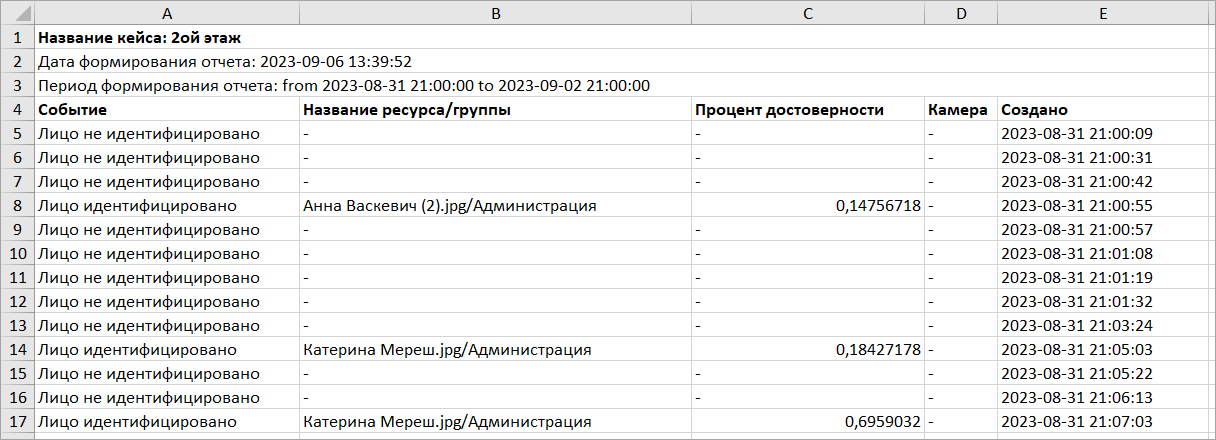 После формирования отчета отобразится сообщение со ссылкой на отчет. Нажмите, чтобы скачать отчет в формате XLXS. Примерный вид отчета:
