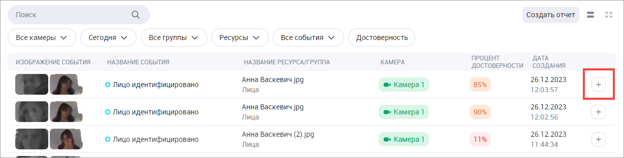 • События – отображаются только определенные события (лицо идентифицировано, лицо не идентифицировано)