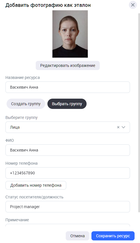 Вид аналитики «Распознавание лиц». Просмотр и редактирование. Web-пользователь