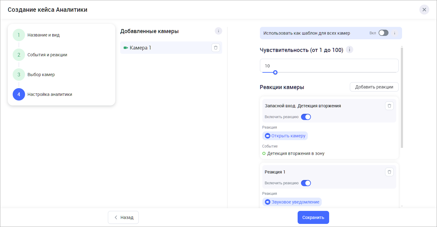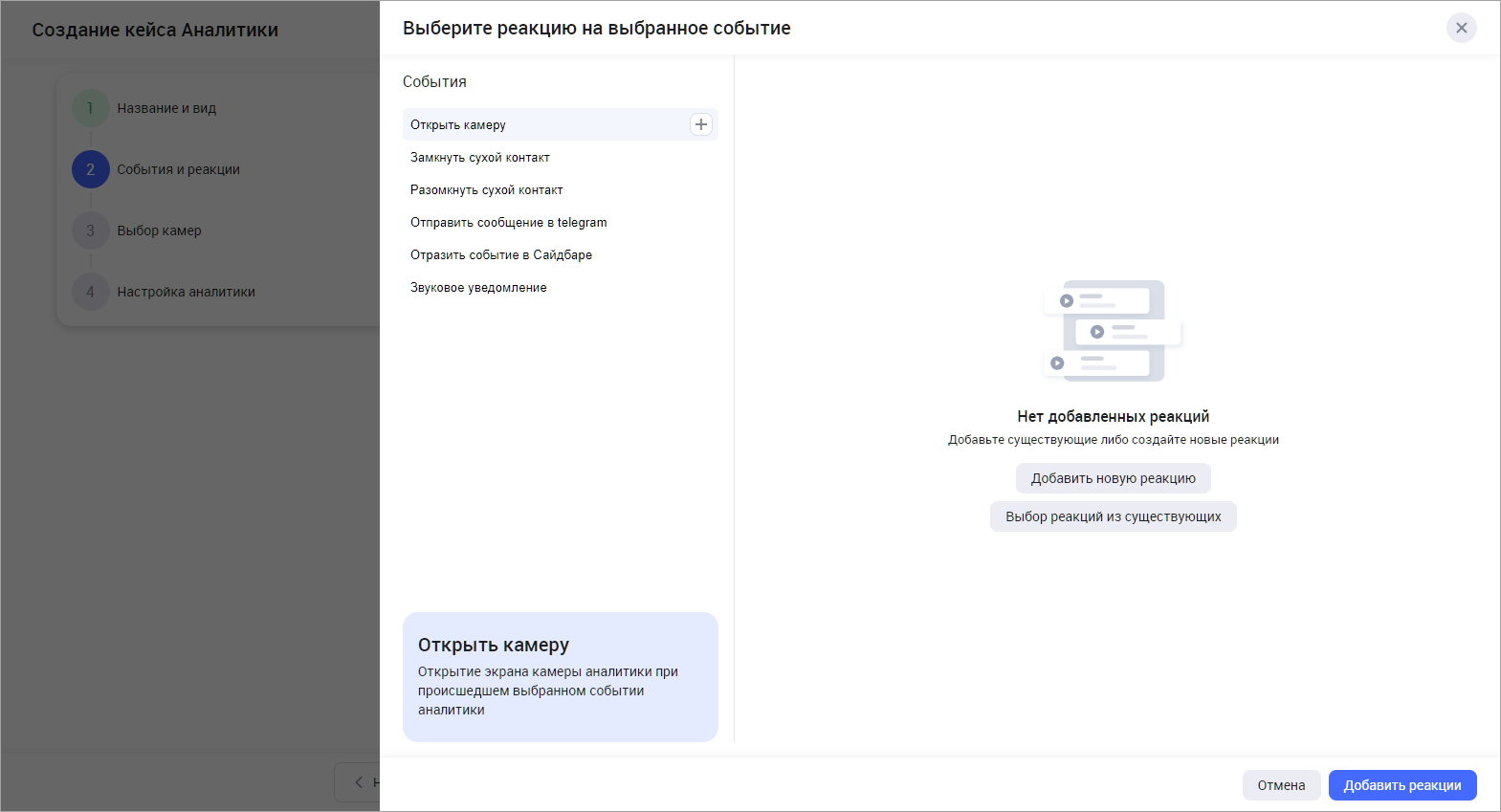 В результате выбранные реации отобразятся в списке реакций выбранного типа для текущего кейса. Для того, чтобы далее использовать созданную реакцию при настройке камер, нажмите «Добавить реакции».