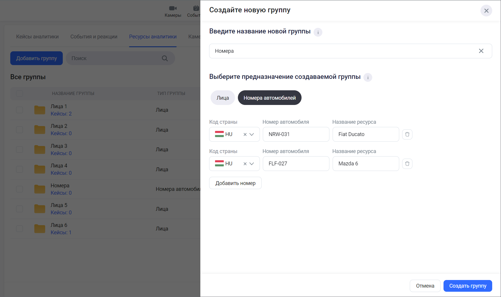 Добавление группы ресурсов в кейсе с видом аналитики «Распознавание номерных знаков»