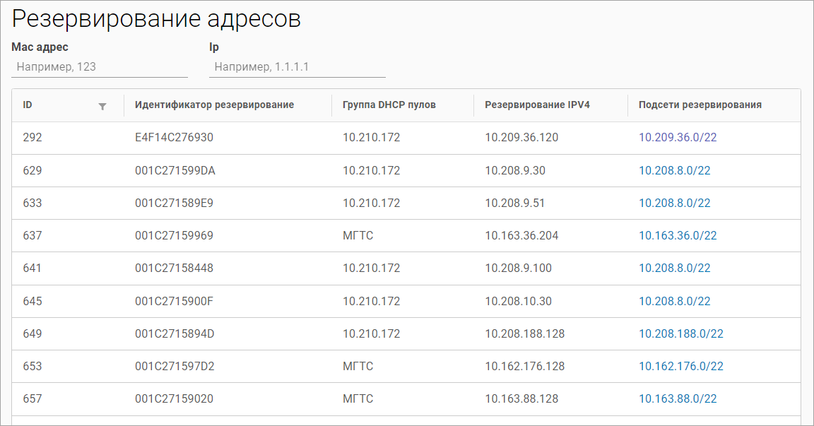 Предусмотрен поиск резервирования по Mac-адресу или IP-адресу.