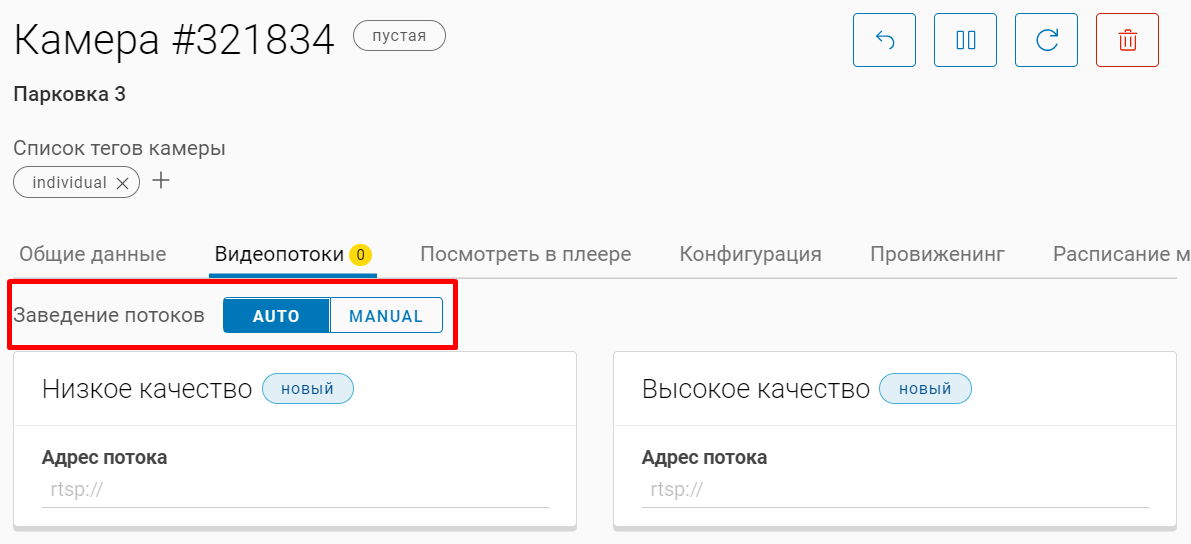 Если на вкладке «Видеопотоки» недоступна возможность добавить ссылки на видеопотоки и нет кнопки «Добавить», переключите тип заведения потоков с «Auto» на «Manual».
