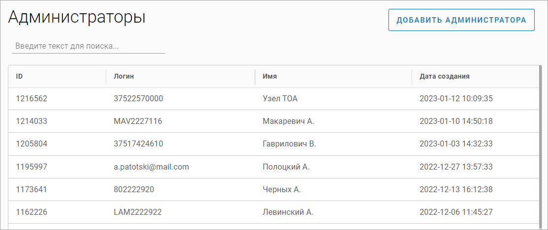 При переходе в раздел «Администраторы» отображается список администраторов системы.