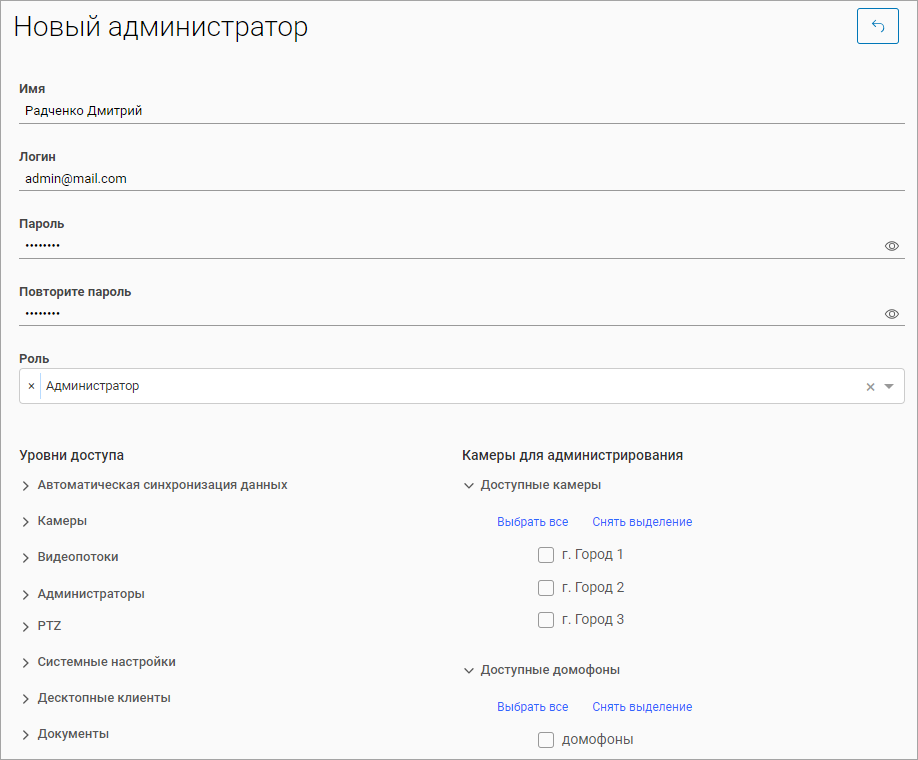«Общая информация» – редактирование ФИО, логина, роли, набора разрешений и камер для администрирования