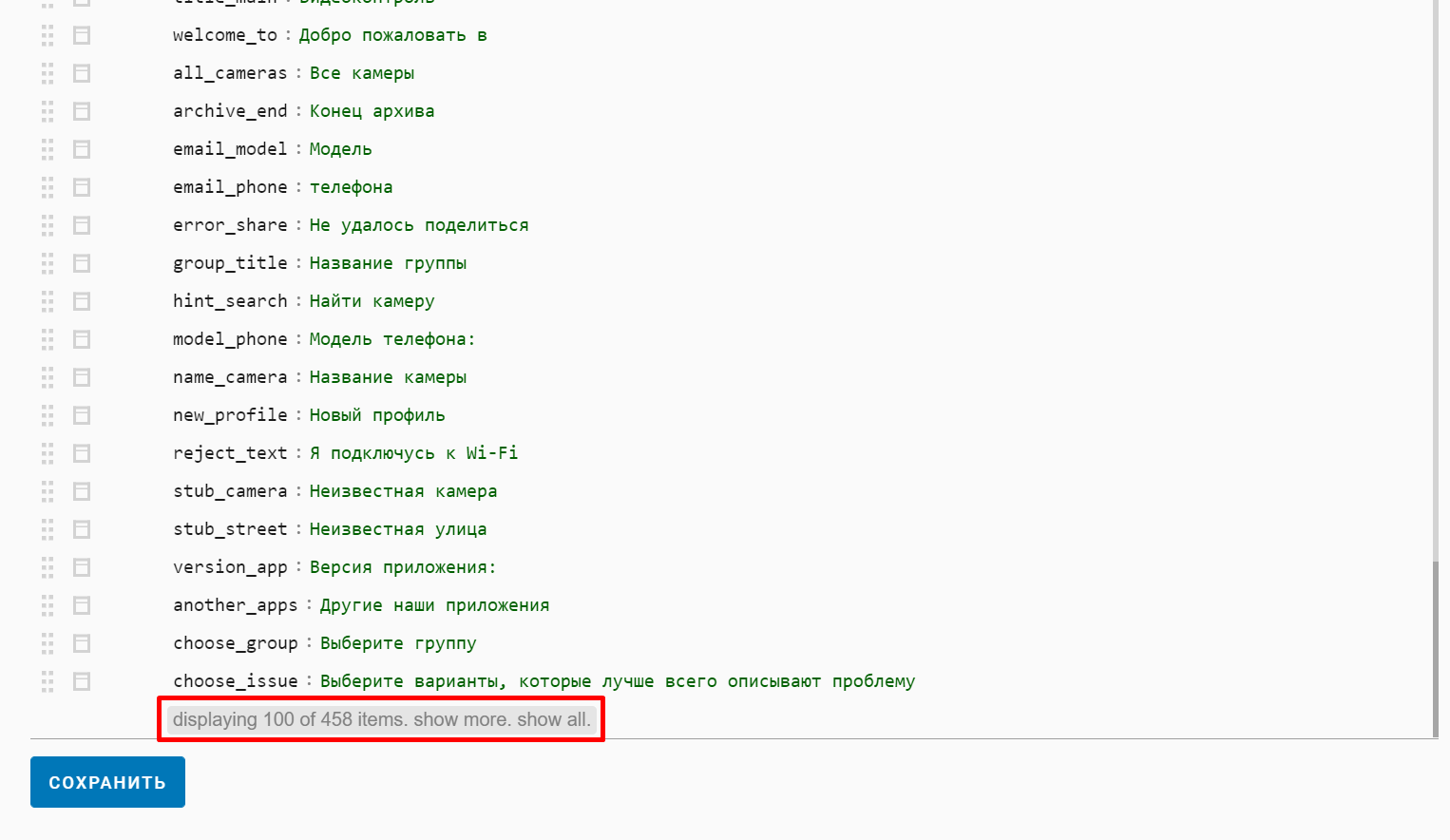 Слева от кнопок отображается количество отображаемых элементов и общее количество.