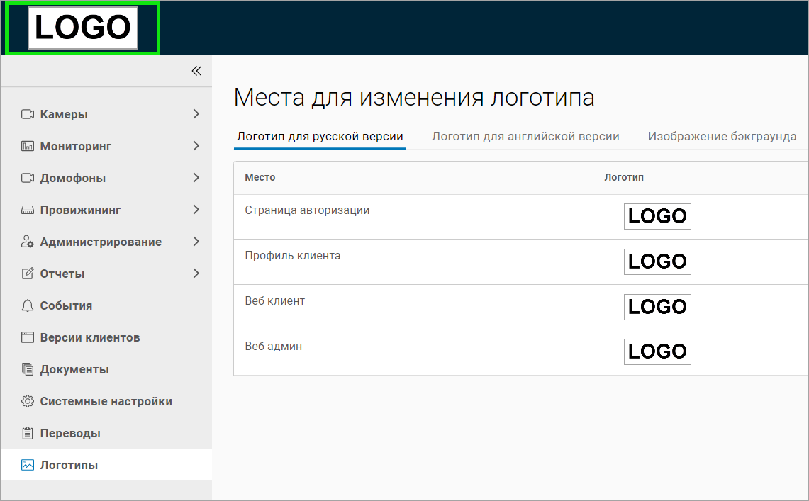 Вкладки «Логотип для русской версии» и «Логотип для английской версии» предназначены для загрузки изображений, которые отображаются в web-интерфейсах администратора и пользователя при выборе русского и английского языка соответственно.