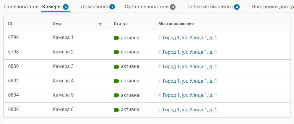 Вкладка «Камеры» предназначена для просмотра камер, которые доступны пользователю.