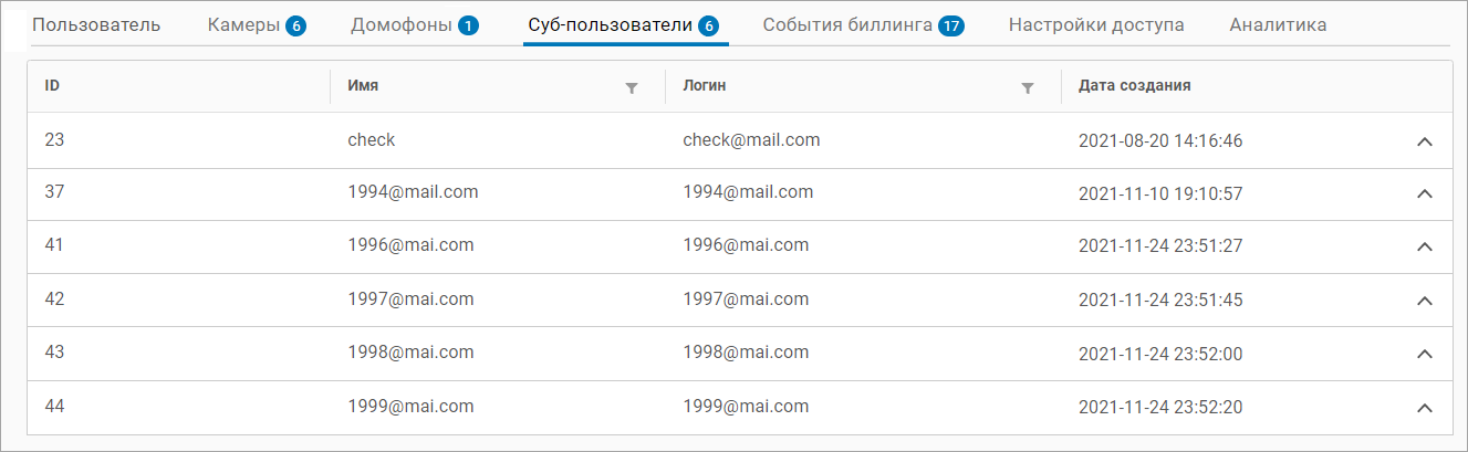 Вкладка «Суб-пользователи» отображает пользователей, которые созданы текущим пользователем в web-интерфейсе пользователя VMS.