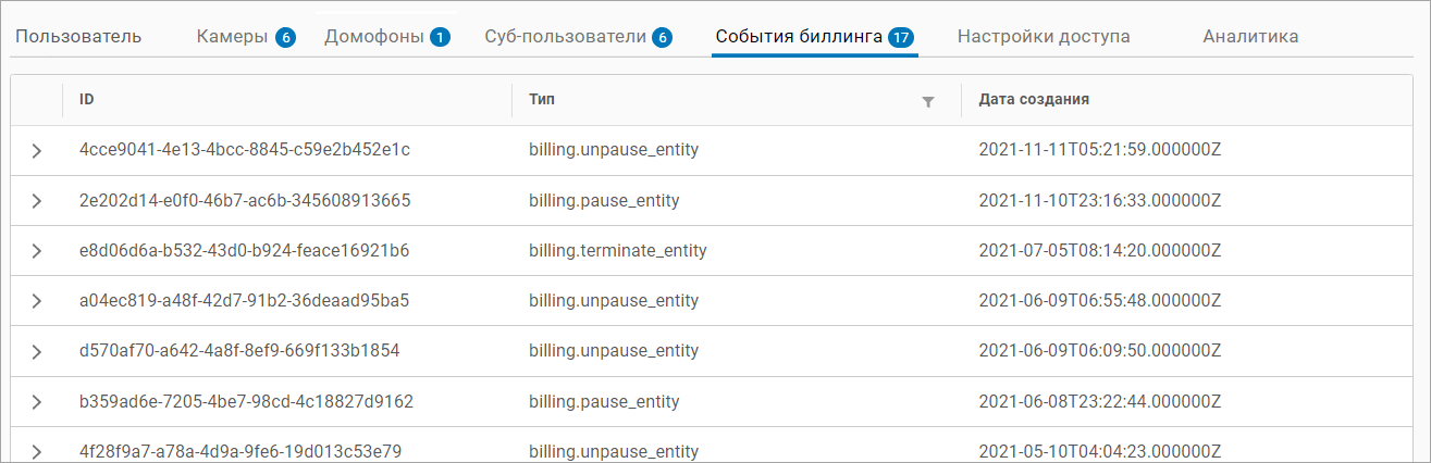 Вкладка «События биллинга» отображает события пользователя, которые приходят с биллинговой системы заказчика.