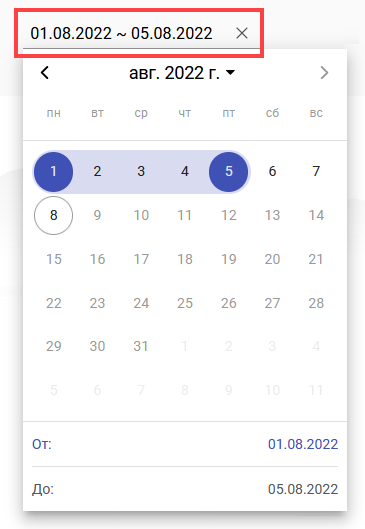 Чтобы настроить временной период нажмите на поле с датами. В результате отобразится календарь для выбора дат «От» и «До»: