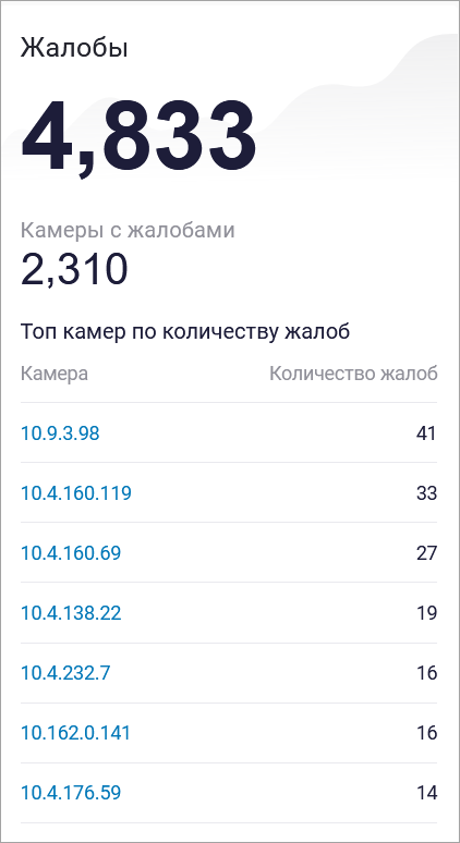 Таблицу «Топ камер по количеству жалоб», состоящую из: