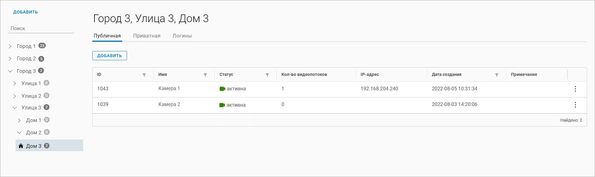 Напротив наименования населенного пункта/улицы/дома указывается общее количество камер.