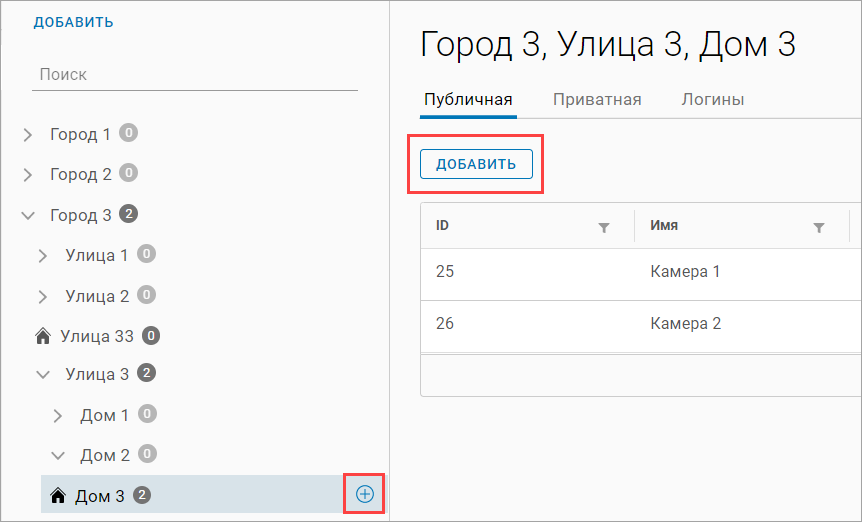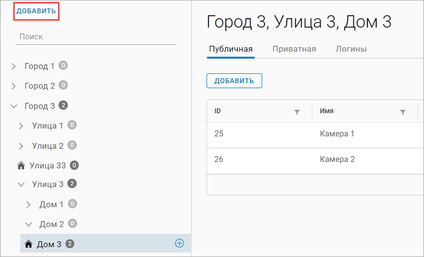 Для навигации по списку камер используется иерархическая структура адресов.