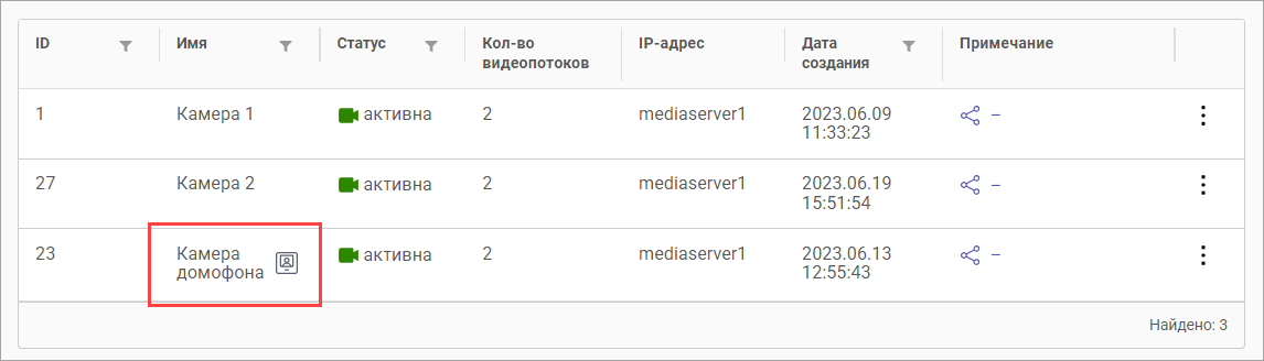 При включенной настройке «Камера домофона» камера в списке обозначается дополнительной иконкой.