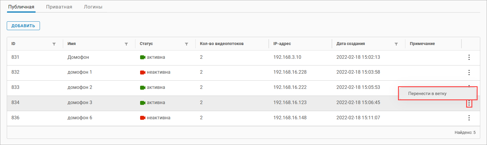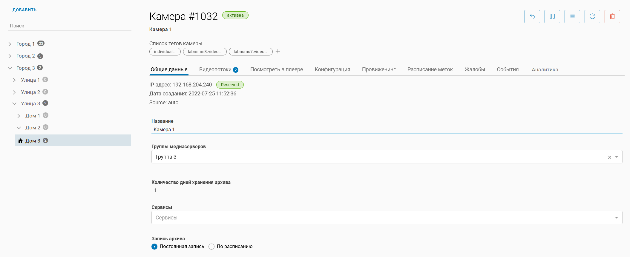 Камеры, доступные по нескольким адресам, отмечены специальным значком (как на рисунке ниже). Добавление дополнительных адресов камере происходит на вкладке «Общие данные». Детально смотрите в разделе документации «Общие данные».