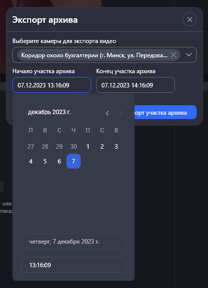 При нажатии кнопки «Сохранить выделенный видеофрагмент» отображается форма выбора даты и времени. Укажите дату и время в соответствующих полях и нажмите «Экспорт участка архива».
