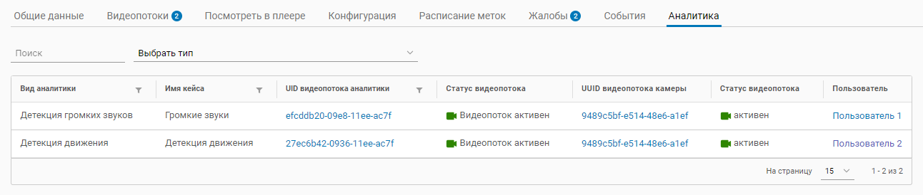 UID видеопотока аналитики – UID видеопотока исполняемого файла аналитики. При нажатии выполняется переход в раздел «Аналитика»