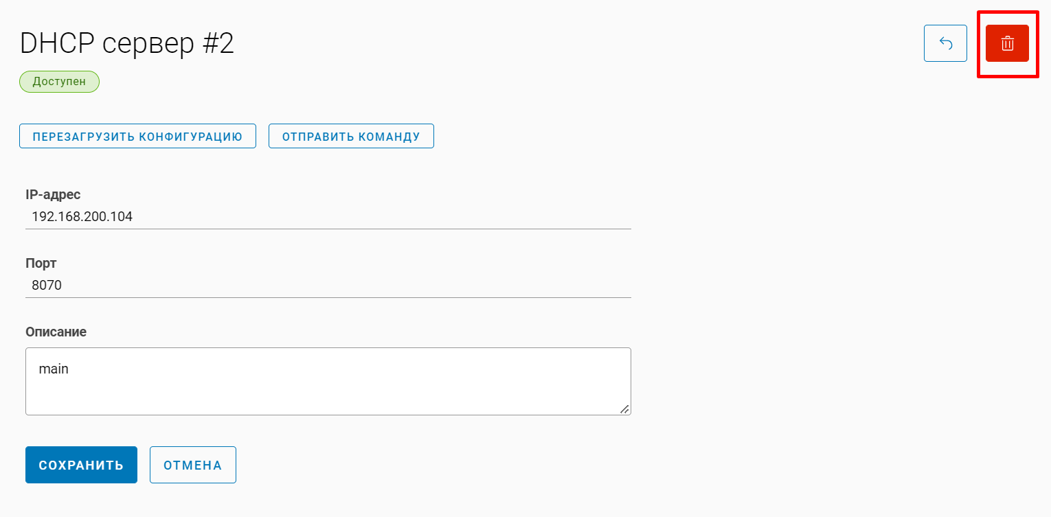 В окне просмотра и редактирования DHCP-сервера нажмите на кнопку удаления