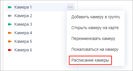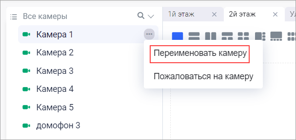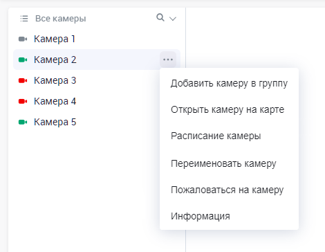 Чтобы открыть контекстное меню, наведите курсор на название камеры и нажмите на
