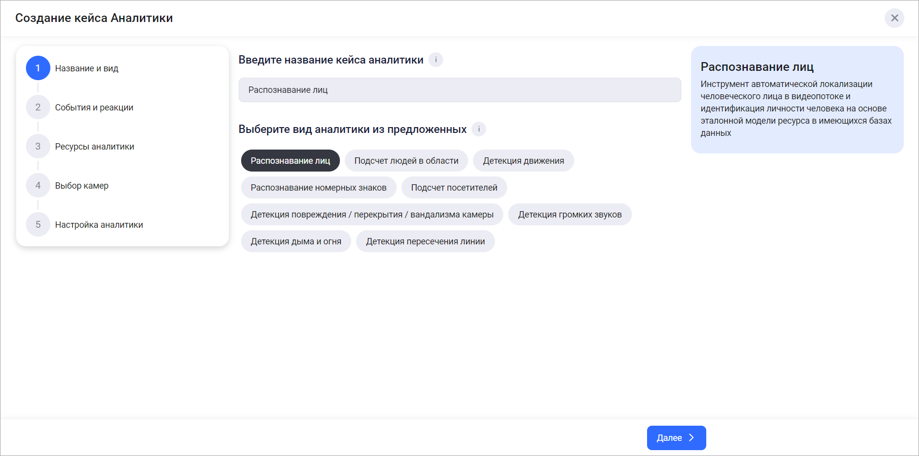 Выберите вид аналитики «Распознавание лиц» из списка