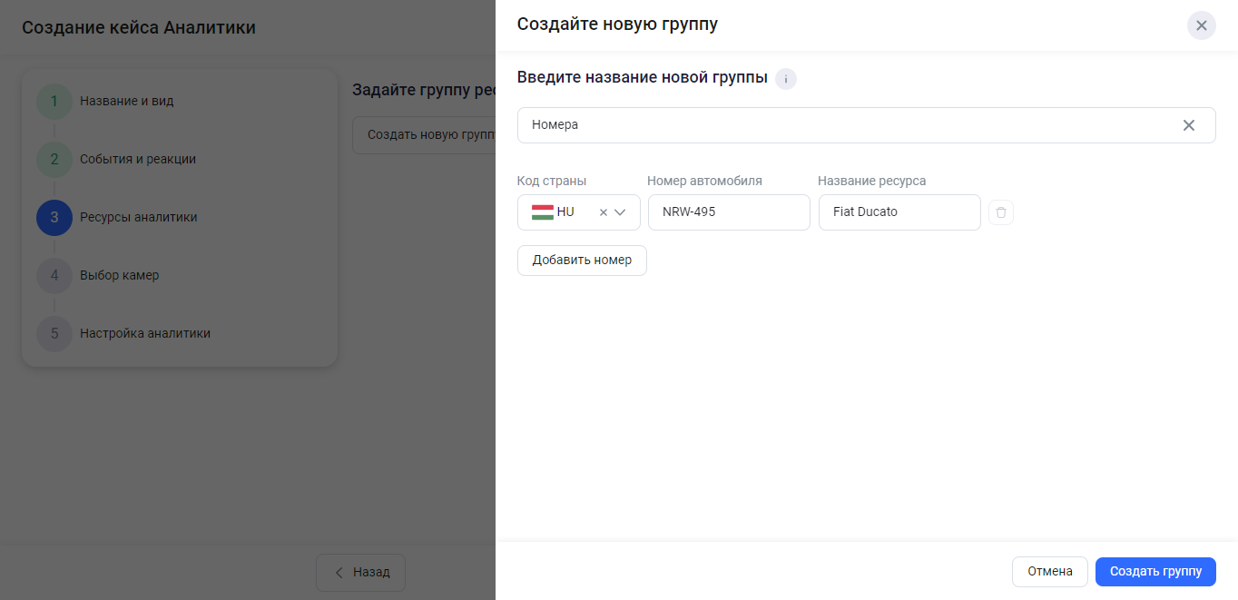 Добавление группы ресурсов в кейсе с видом аналитики «Распознавание номерных знаков»