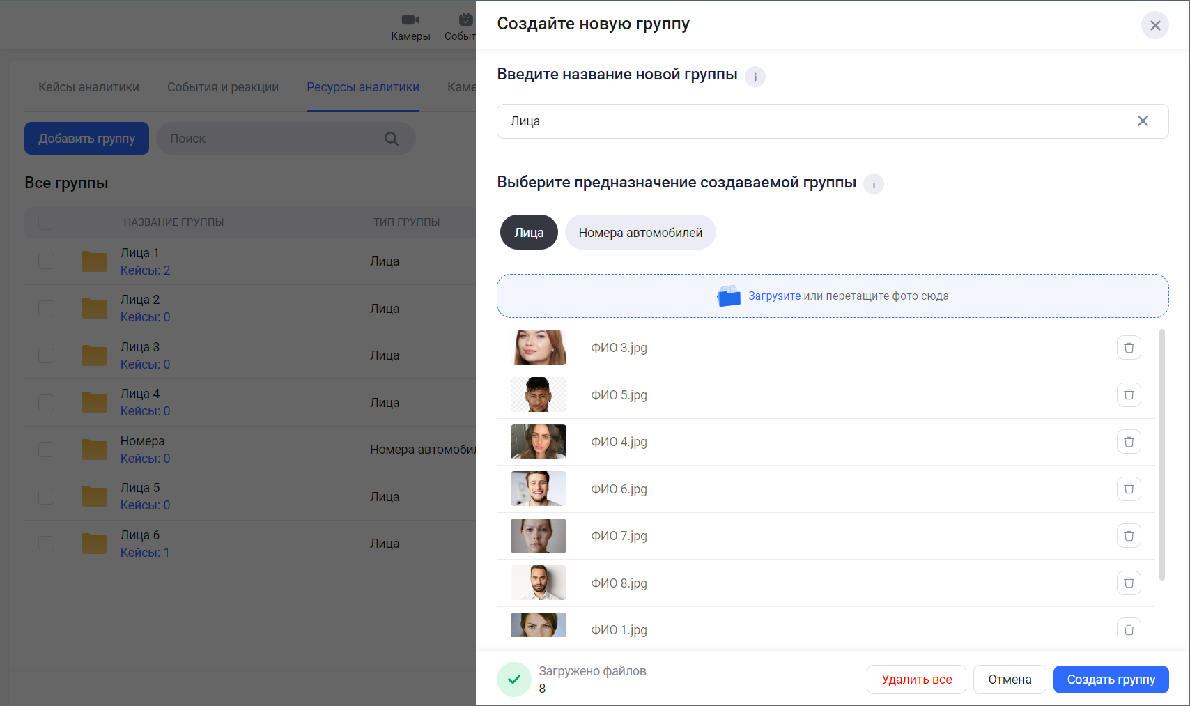 Добавление группы ресурсов в кейсе с видом аналитики «Распознавание лиц»