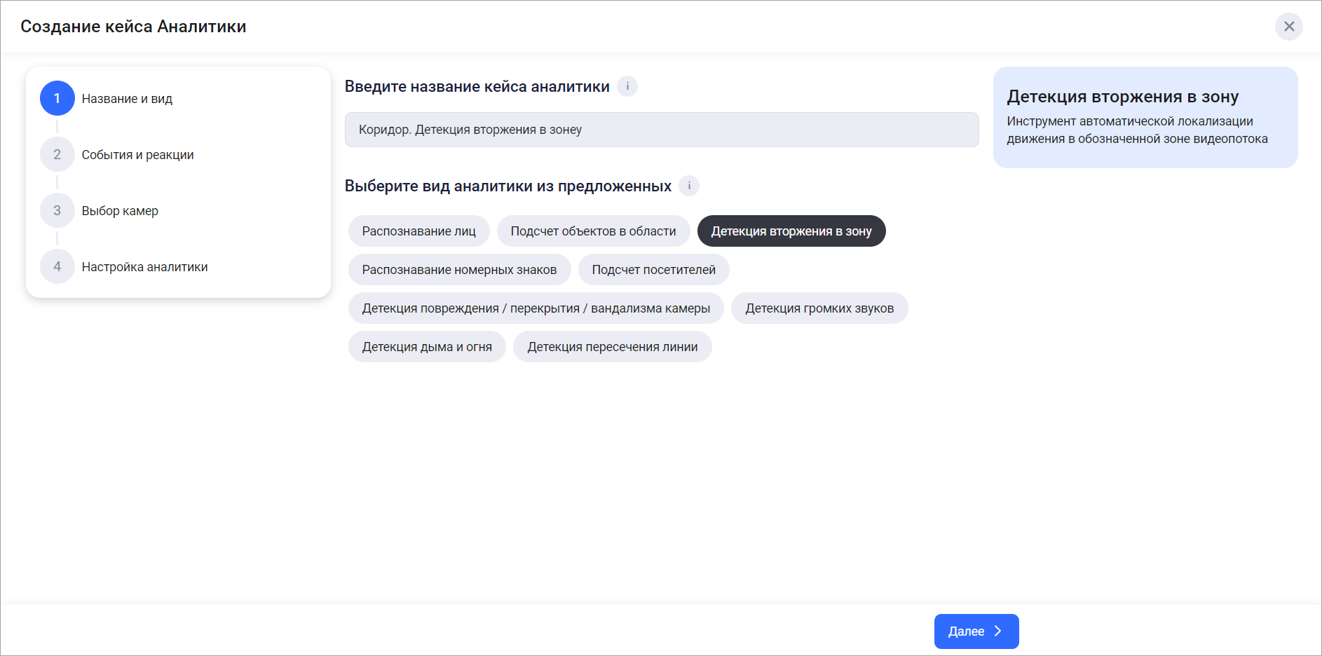 Вид аналитики «Детекция вторжения в зону» предназначен для детекции движения в обозначенной зоне, настроенной в процессе добавления кейса аналитики.