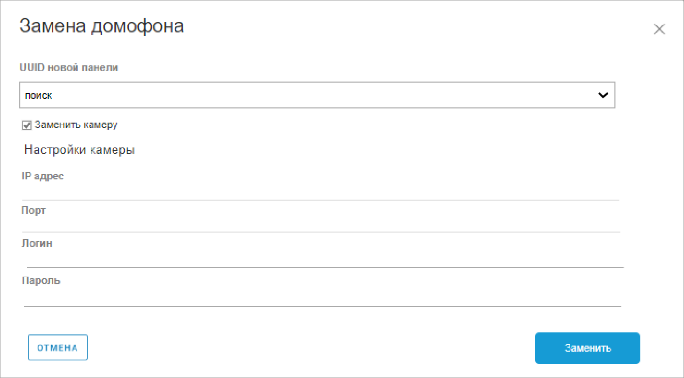 Также предусмотрена возможность замены камеры домофона. Для этого включите настройку «Заменить камеру». В результате на форме отобразятся дополнительные поля для редактирования сетевых настроек камеры.